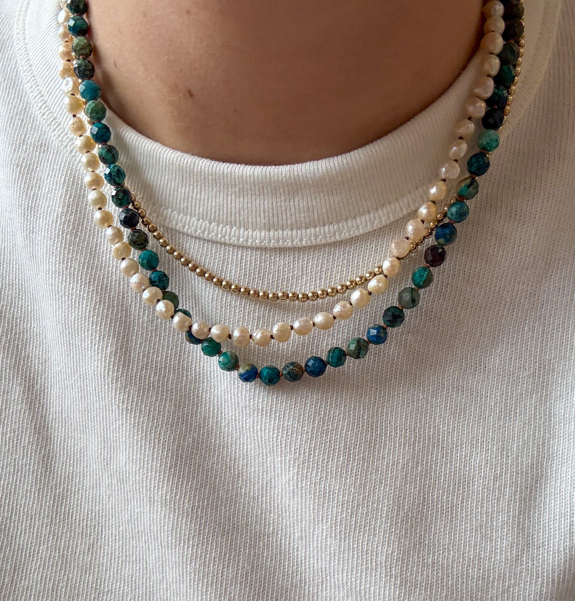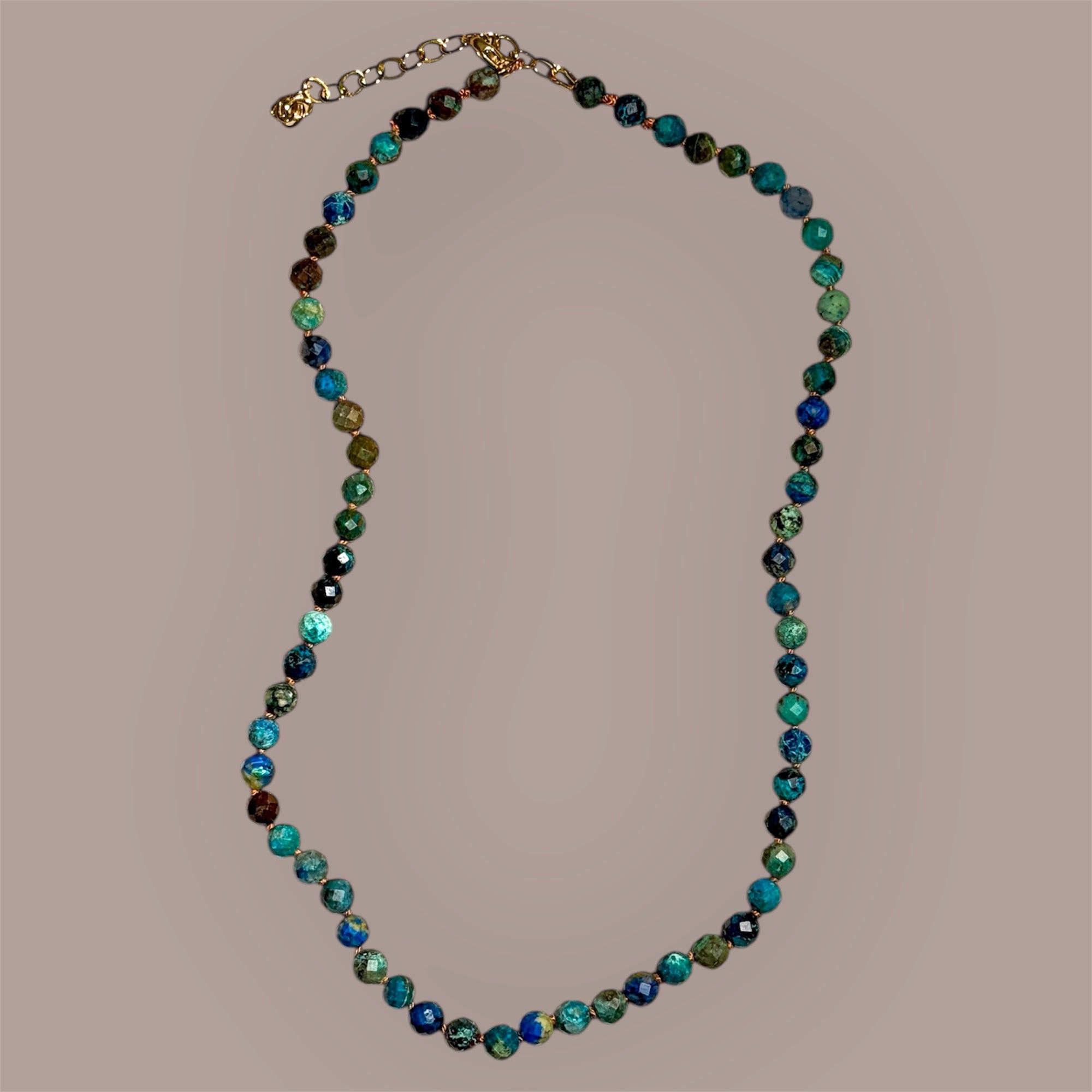Faceted round Chrysocolla beads hand-knotted to make this stunning layering necklace.