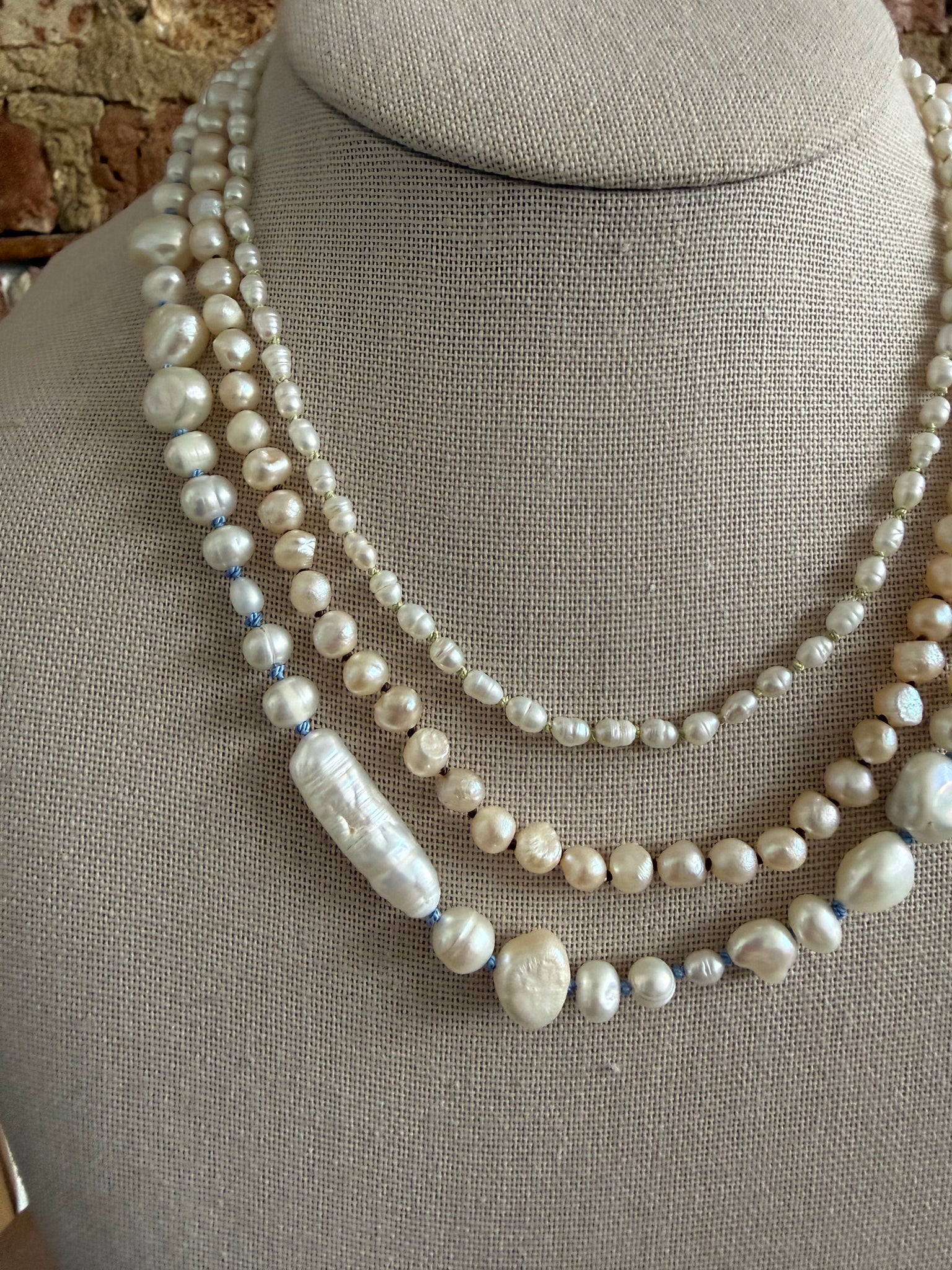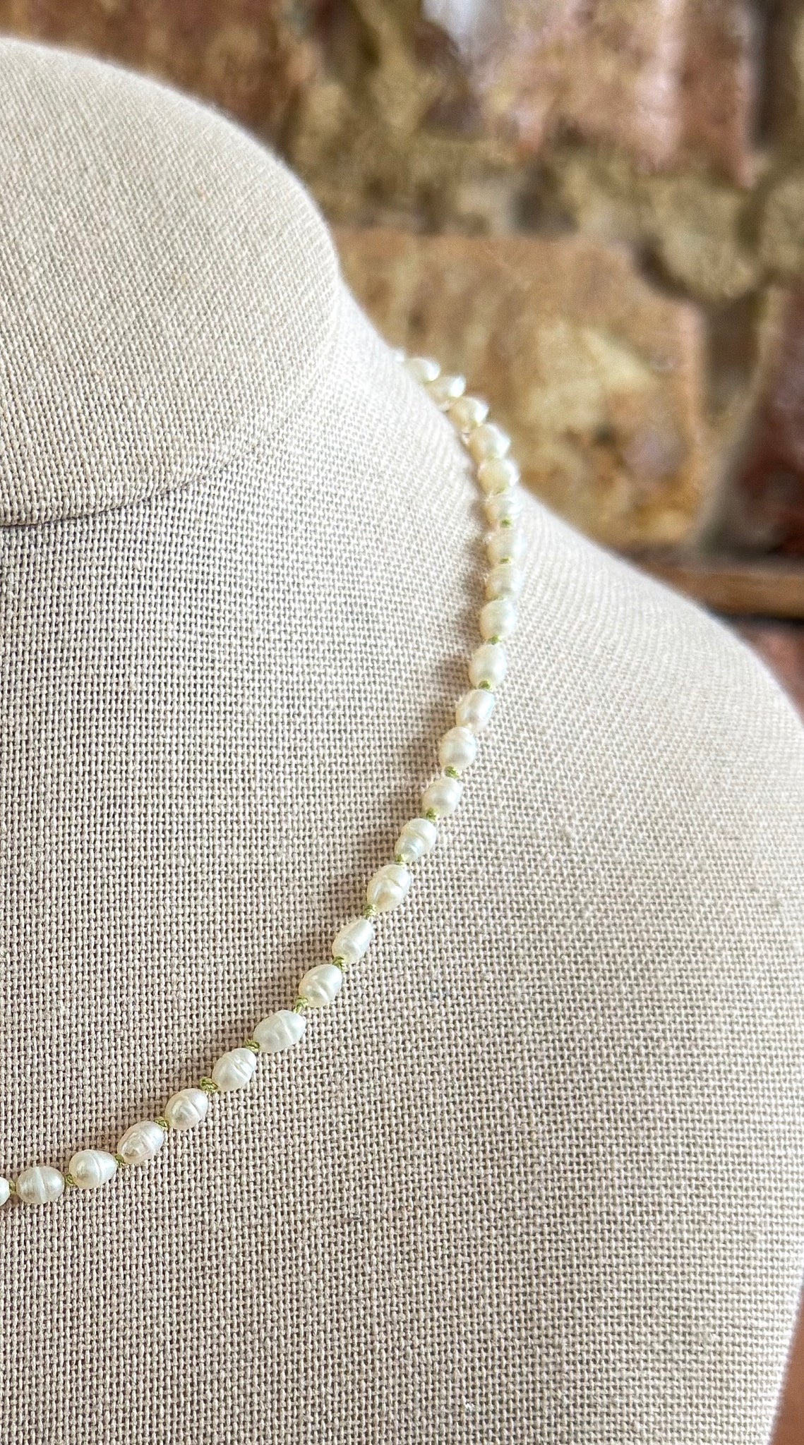 A beautiful, dainty hand-knotted pearl necklace on light green silk cord. A fun twist to a pearl necklace. Perfect to layer or wear solo!